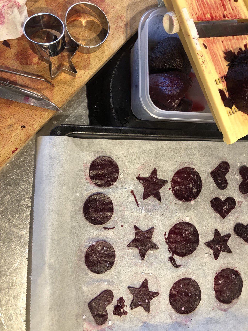 - Amusez-vous à découper les tuiles de betterave avec des emporte-pièce variés. Photo ci-après.
