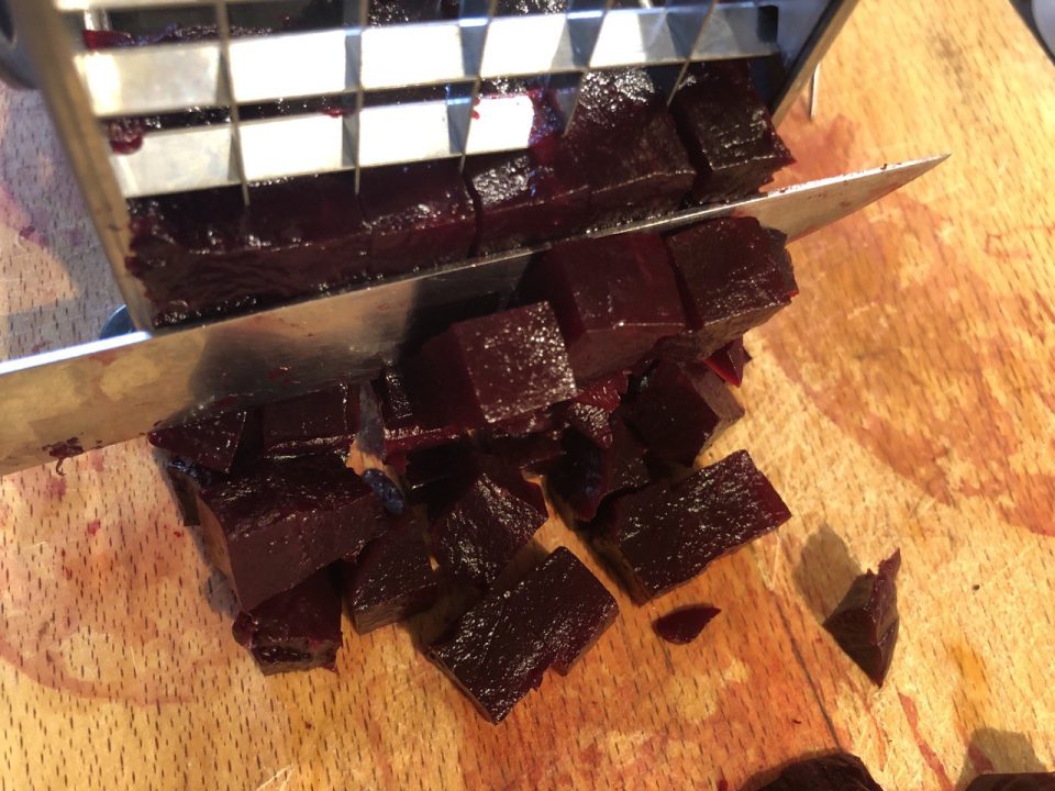 - Pour obtenir des cubes de betterave très réguliers sans machine, placez-les dans un coupe-frites et taillez à la verticale devant la grille. Il vous faut un couteau très aiguisé pour cela – voir photo ci-dessous.