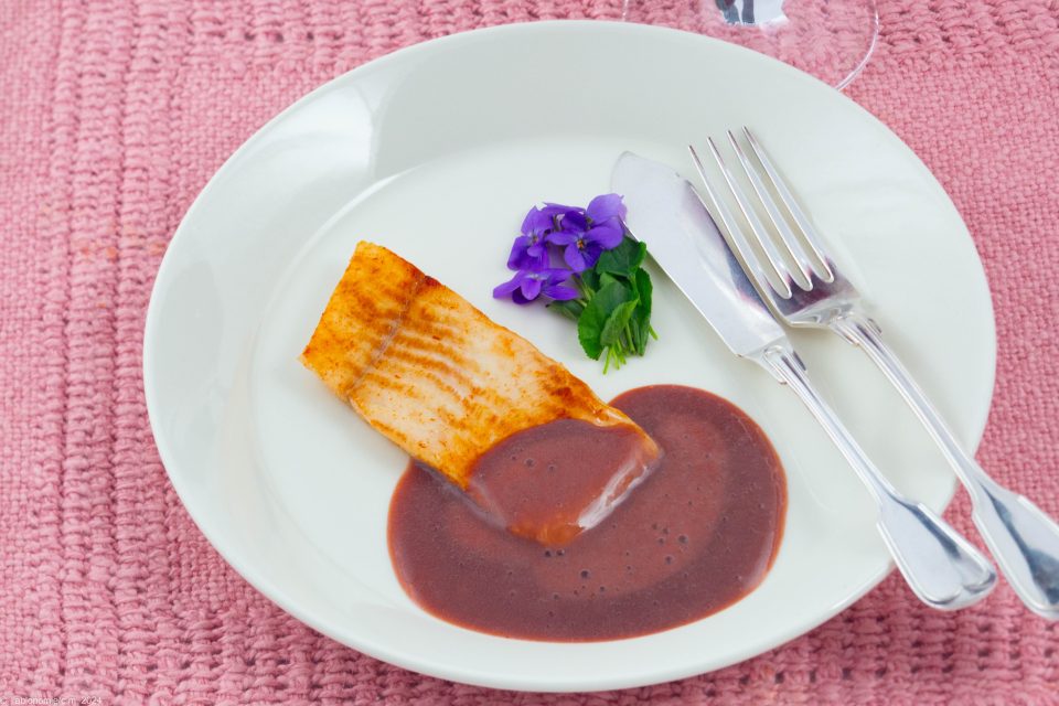 DRESSAGE : Dressez aussitôt sur assiette non préchauffée. Siphonez de la sauce dans un petit bol puis nappez partiellement le poisson à la cuillière (et pas directement du siphon). Décorez l’assiette d’un peu de vert: pluches de persil, feuilles sauvages… Pommes-vapeur en garniture. Servez immédiatement car la chaleur finirait par dissoudre l’espuma.