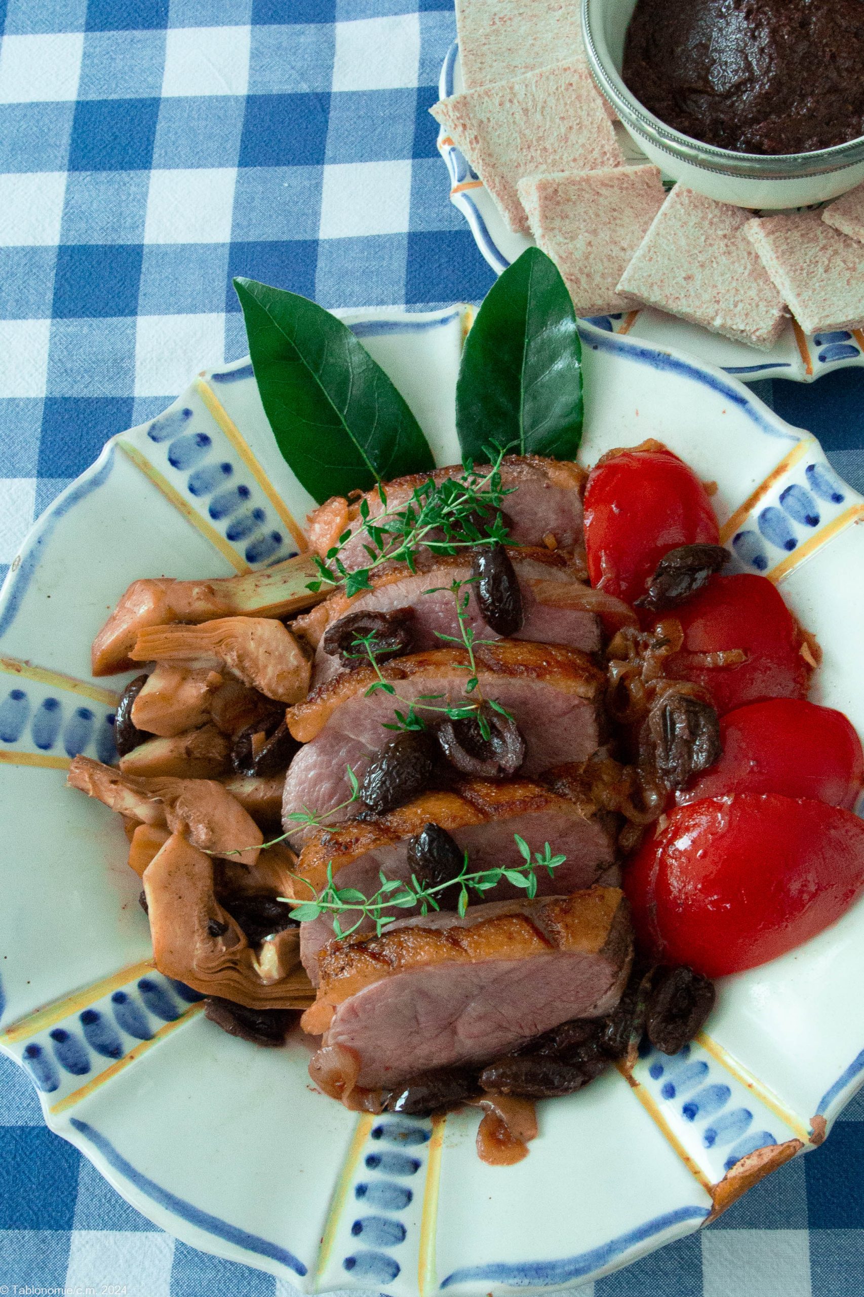 DRESSAGE : Disposez le magret au centre du plat, accompagné des tomates, oignons et des artichauts. Versez le fantastique jus de cuisson sur les légumes. Décorez des tomates crues, du reste d’olives et de thym. Servez tapenade et « biscottes du soleil » à part.